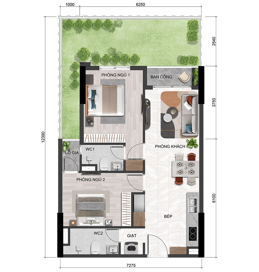* Tỷ lệ xây dựng thấp (~35%), phần lớn diện tích dành cho không gian xanh và tiện ích nội khu